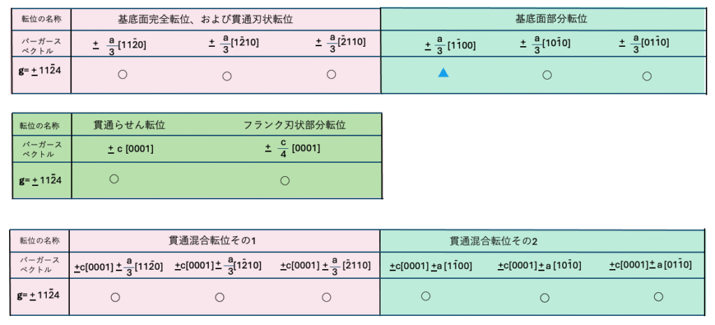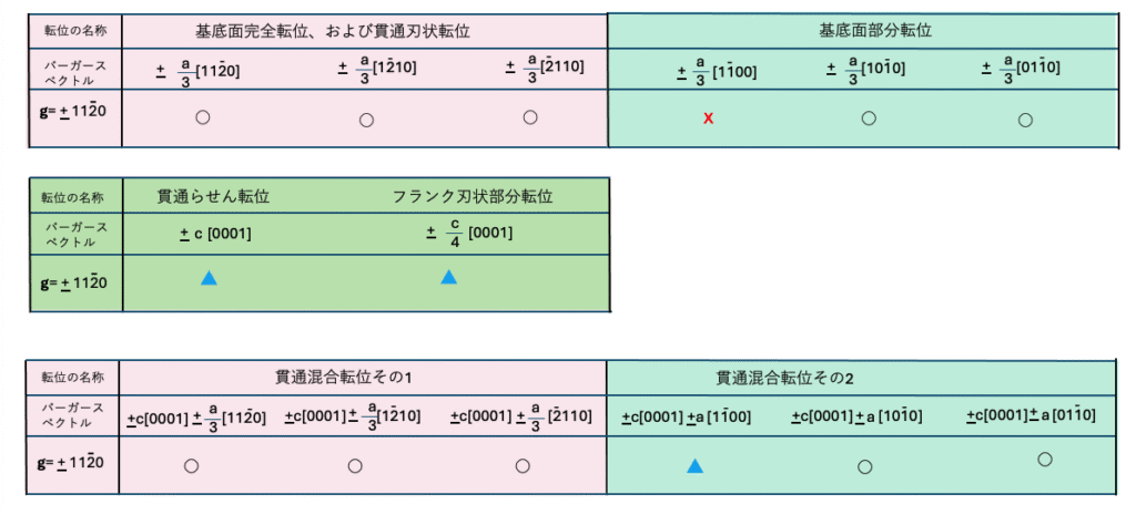 表3-2 g=±1124の回折条件での各種転位の観察の可否。○印のものは観察可能。赤いX印のものは観察不可な転位。青三角は基本的には観察観察不可だが、転位の向きに依存して刃状転位成分のコントラストが観察可能な場合がある。