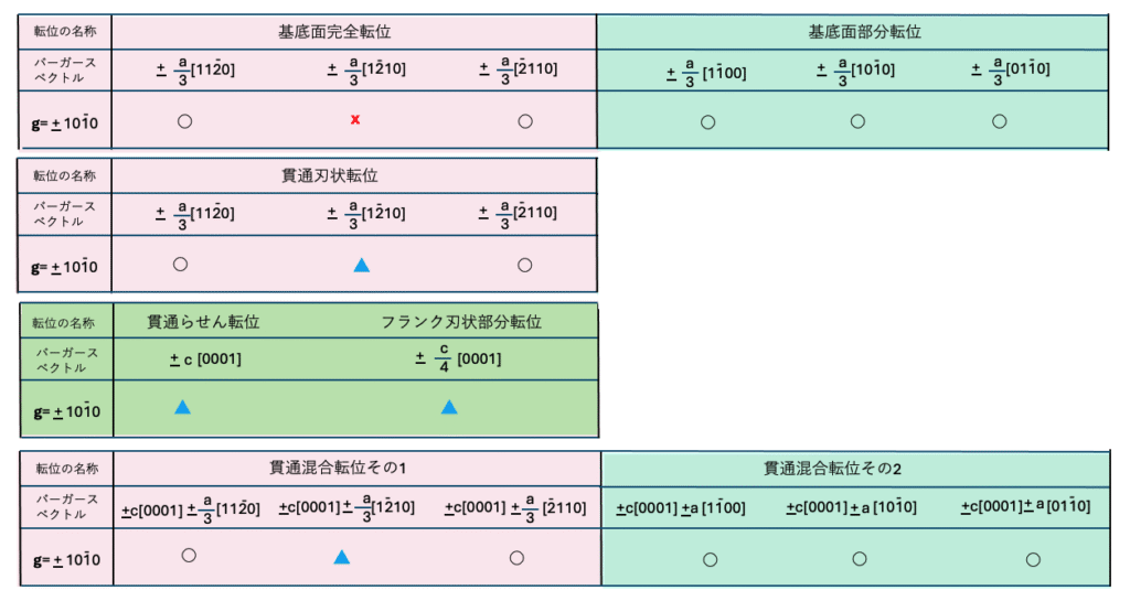 表3-3 g=±1010の回折条件での各種転位の観察の可否。○印のものは観察可能。赤いX印のものは観察不可な転位。青三角は基本的には観察されないが、転位の向きに依存して刃状転位成分のコントラストが観察可能な場合がある。