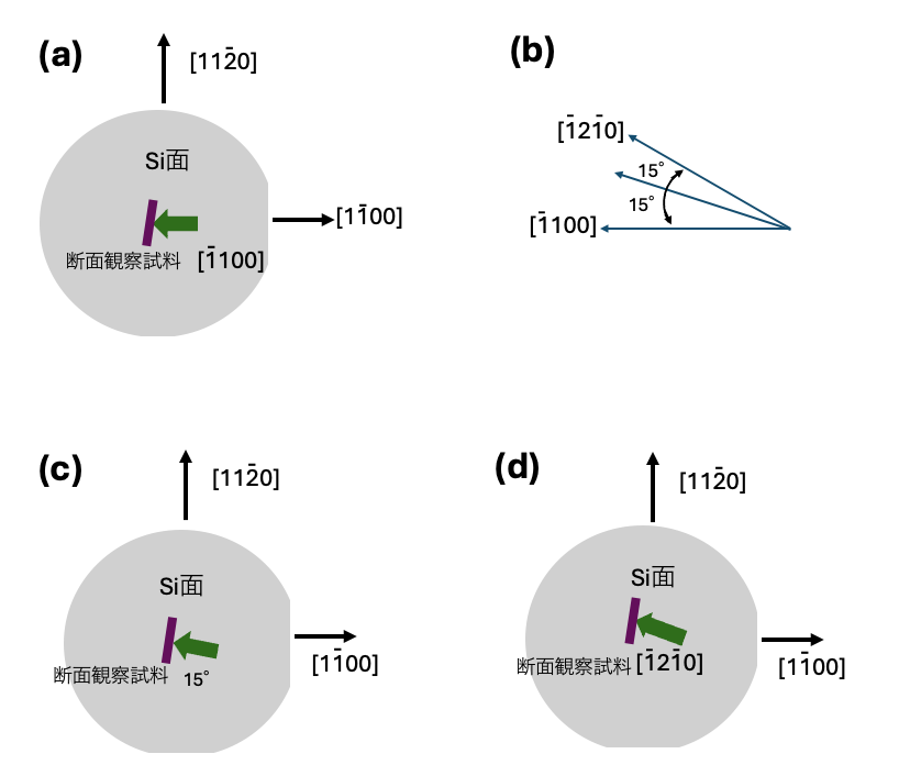[1100]方向の断面試料の観察を考察します。図3-1 (a)は[1100]の観察方向とウエハの形状を示しています。緑色の矢印が観察する方向です。この方向での観察は、デバイス構造の観察などによく行われます。図3-1(c)は[1100]方向から15°右方向に観察方向を示しています。実際には、この方向への観察は行いません。この方向は、[1100]方向と[1210]方向の中点の方向です。この方向への観察を行う試料を作り、[1100]方向と[1210]方向の観察を行います。図3-1(d)は[1100]方向から30°左方向に観察方向を変えた時の[1210]方向を観察方向とする際の観察方向です。図3-1 (b)はこれらの観察方向の関係を示しています。[1100]方向の断面観察の場合、例えば[1210]方向への観察もついでに行うことが必要です。その理由は前回の[1120]の場合と同じような理由です。