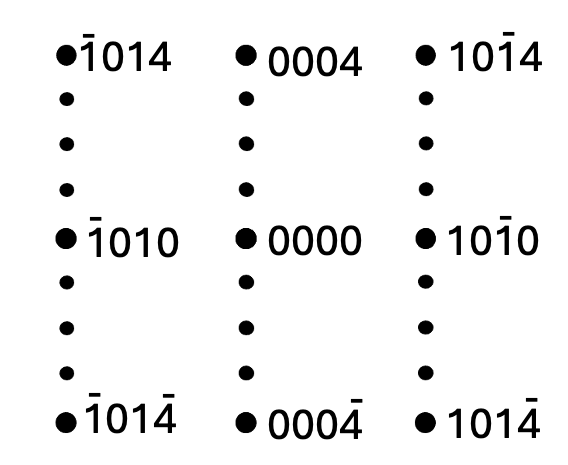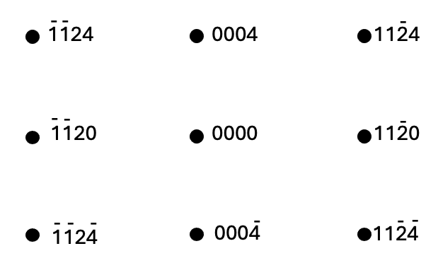 [1100]方向へ向いた時の回折図形を図3-2に示します。この回折図形は、図2-4で示されている回折図形とよく似た図形です。この回折図形からわかるように、g=±0004,g=±1120, g=±1124は利用できそうです。
