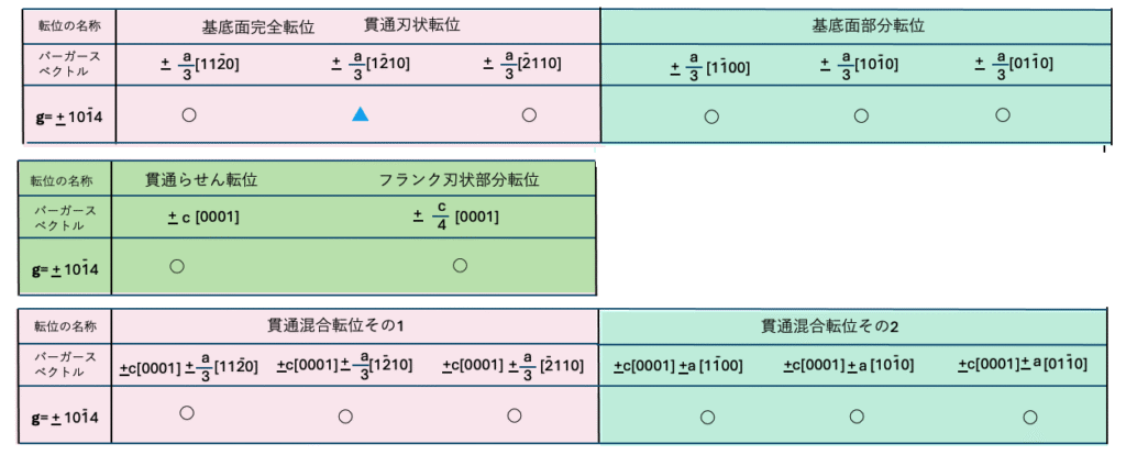 表3-4 g=±1014の回折条件での各種転位の観察の可否。○印のものは観察可能。赤いX印のものは観察不可な転位。青三角は基本的には観察されないが、転位の向きに依存して刃状転位成分のコントラストが観察可能な場合がある。