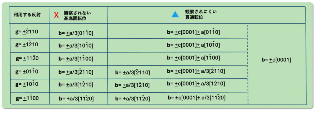 表3-5 は [0001]方向の近辺で利用する反射と、それぞれの反射で観察することができない転位を示しています。この表の青三角印の観察されにくい転位とは、基本的にコントラストが現れない転位です。しかしながら、転位の向きに依存して転位のコントラストが現れたり消失したりする場合を、観察されにくい転位と表現しています。