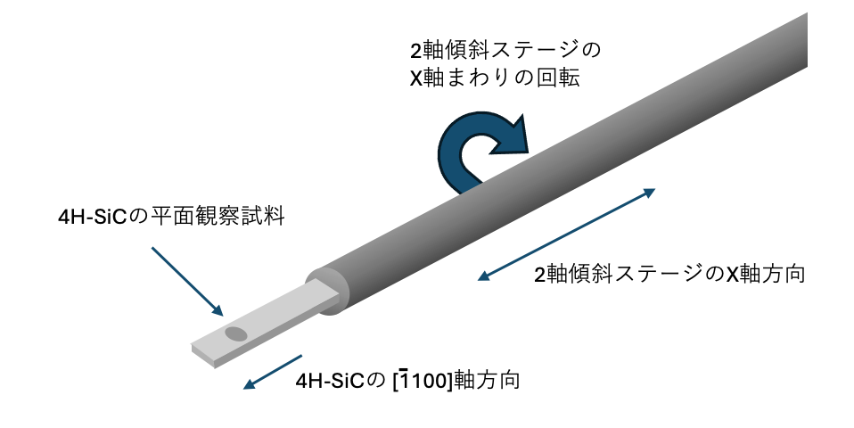 4H-SiCの平面方向からの観察試料を作製し、2軸傾斜ホルダーに装着して透過型電子顕微鏡に導入します。この時に試料の1[1100]方向を、2軸傾斜ホルダーのX回転軸と一致させておくと便利です。2軸傾斜ホルダーのX回転軸とは、図3-5に示すように、棒状の2軸傾斜ホルダーの長手方向の回転軸だと、ここでは記述しておきます。