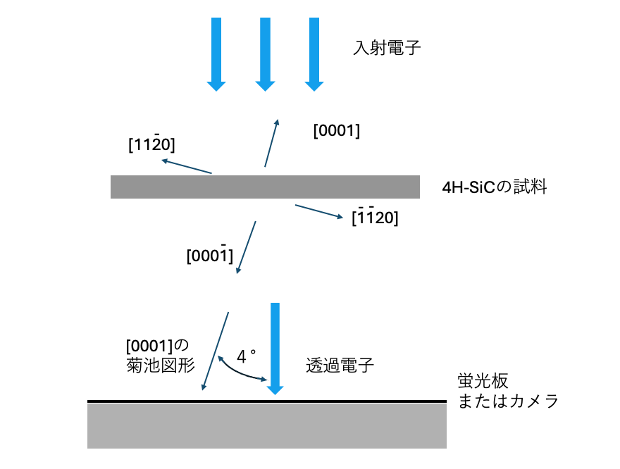 4H-SiCのウエハ表面方向は通常、[0001]方向から[1120]方向へ4°傾いています。ゴニオメーターを動かさない状態で回折図形を見ると、試料表面に垂直方向から4°離れた位置に、“ひまわりの花” あるいは”お日様マーク”に似た菊池図形が現れます。、この菊池図形は± [0001]晶帯軸の方向を表しています。これらの関係を模式的に図3-4に示します。