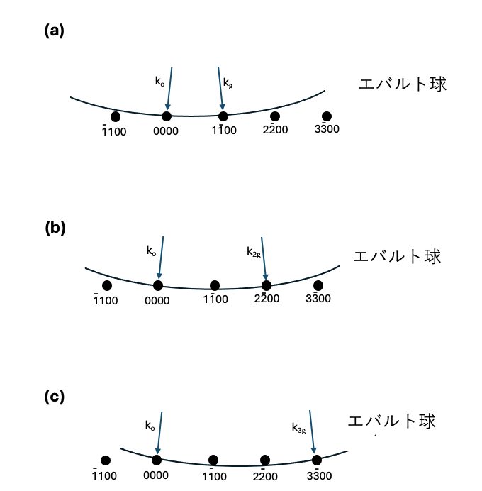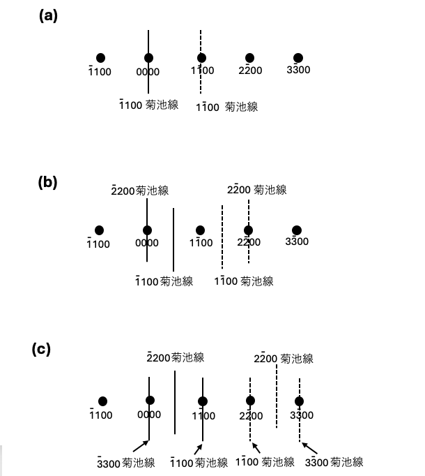 図3-7 実際に観察される回折図形。(a) 1100反射が回折条件を満たしている状態。(b) 2200反射が回折条件を満たしている状態。(c) 3300反射が回折条件を満たしている状態。