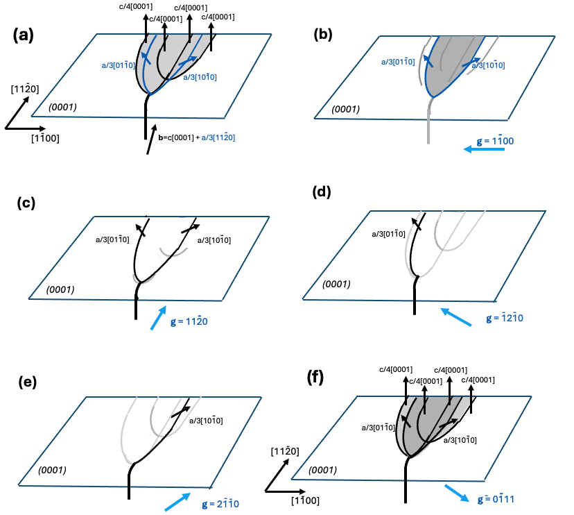 図4-8(a)はb=c[0001] + a/3[1120]の貫通混合転位が、基底面に沿うように向きを変えた時の推察される構造のモデルです。b=c[0001]の成分は図4-5,図4-7と同様に、4本のフランク型刃状部分転位に分解し、b= a/3[1120]の成分は、2本のショックレー型部分転位に分解し、合計6本の部分転位に分解している場合を考えます。フランク型刃状部分転位成分とショックレー型部分転位成分を合わせ持つ部分転位2本とフランク型部分転位2本の合計4本に分解するようなモデルも考えられるかもしれません。また5本に分裂するようなモデルも考えられるかもしれません。ここでは6本に分裂した部分を観察するとどう見えるのかを推察します。図4-8(a)のような構造のモデルだと、図4-8(b),(c),(d),(e),(f)のようなコントラストが変化することが推察されます。実際に実験で観察した報告が無いと思いますので、こういう構造ではこういうふうに見えるはずという、推察の図です。
