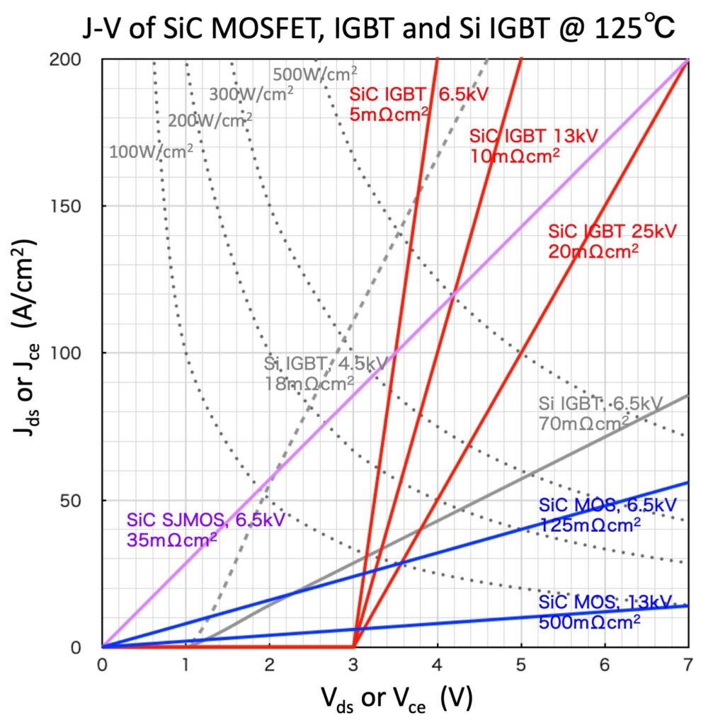 - 4.5kV Si IGBT: 東芝とInfineonプレスパックのデータシートより、接合温度125℃で定格電流電圧を通るRonAdiffで近似。電流密度換算に必要なチップ面積は分解写真等から筆者推定。