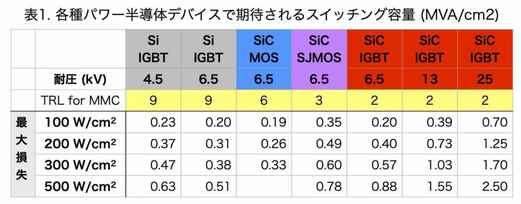例えばモーター駆動インバータでは、スイッチング周波数が 数kHz 〜 数10kHz と比較的高いので、スイッチング損失が無視できず、導通損失とスイッチング損失が同程度になるよう設計するのが最適とされている。小論で取り上げる電力系統のMMCでは、スイッチング周波数が 数100Hz と低いので、多少のスイッチング損失には目をつぶっても導通損失が小さい素子が望ましいと言える。